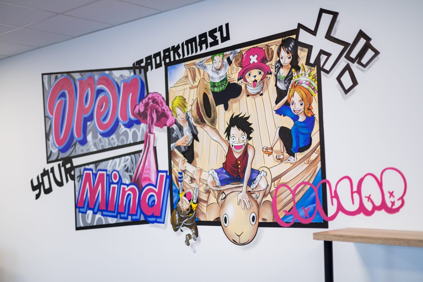 Cet espace de travail collaboratif a fait appel à nos artiste graffeurs pour réaliser une décoration mêlant leurs inspirations. voici ce qu'il ressort quand on mélange manga, hip hop et graffiti