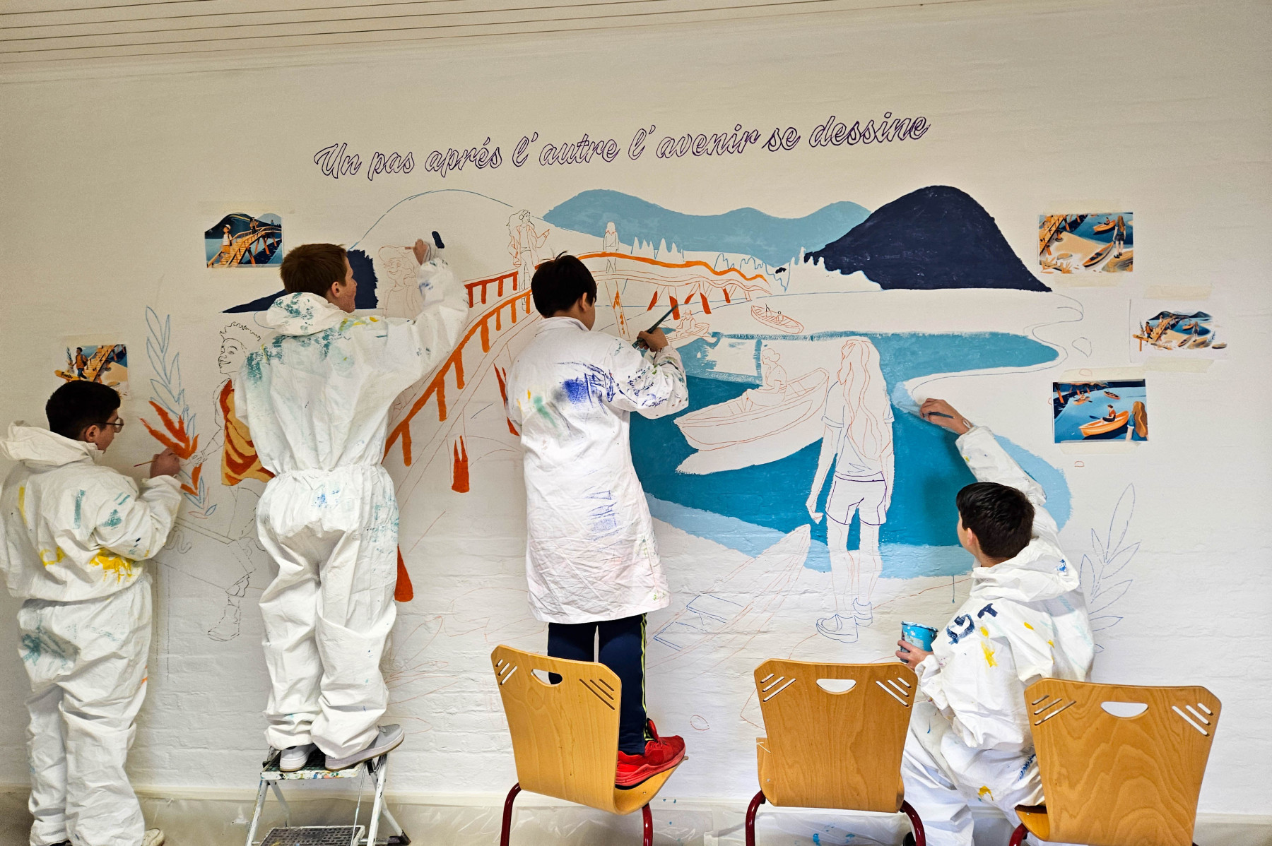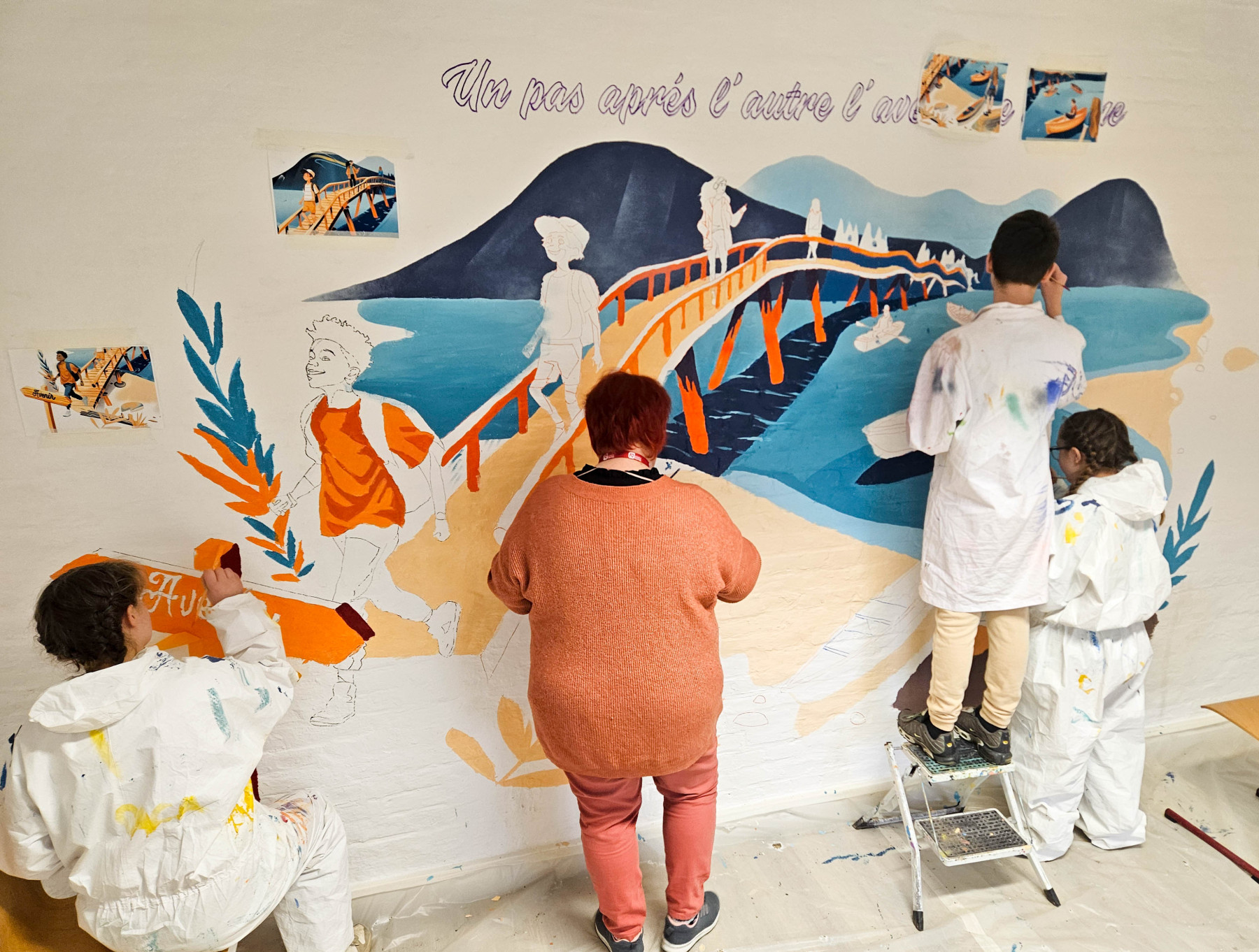 L'association des apprentis d'Auteuil souhaitait mettre en place un atelier de fresque participative dans une salle destiné au activités de loisir de ses jeunes résidents. Cette fresque réalisé par notre artiste graffeur a été été pensé par les jeunes elle symbolise la traversé qu'ils entreprennent sur ce pont accidenté avec leurs éducateurs autour veillant sur eux, se projetant vers un avenir radieux.