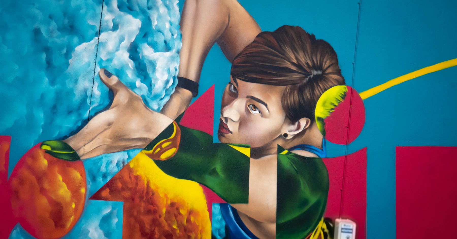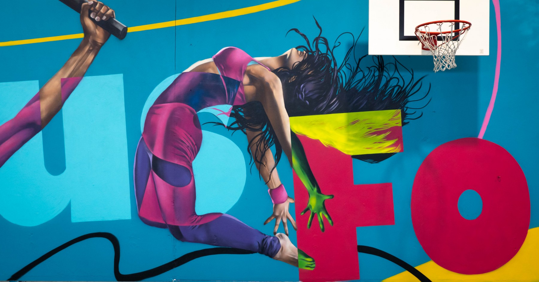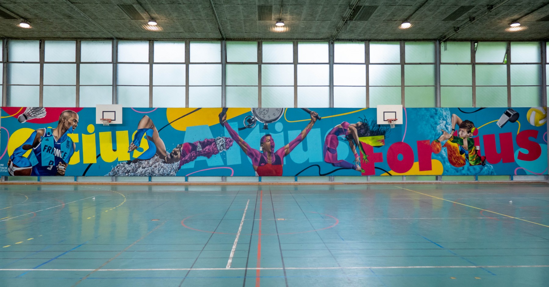 Une fresque de prés de 50 m de long sur le thème des jeux olympiques avec la devise original en transparence citius altius fortis : plus vite, plus haut plus fort ! Nos graffeurs professionnels ont travaillé sur un concept coloré qui agit comme des filtres sur les personnages.
