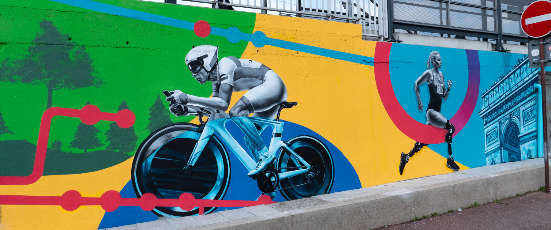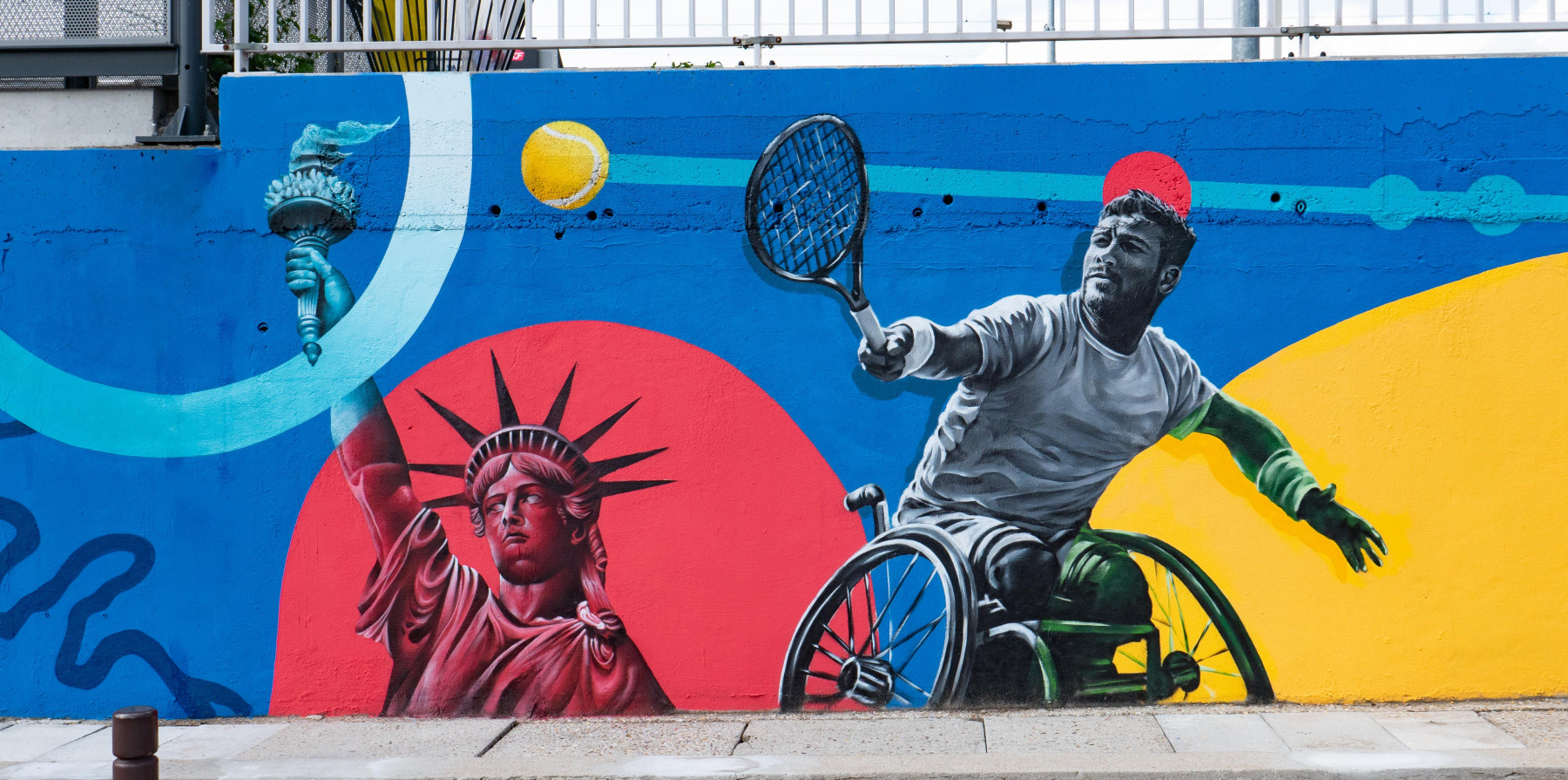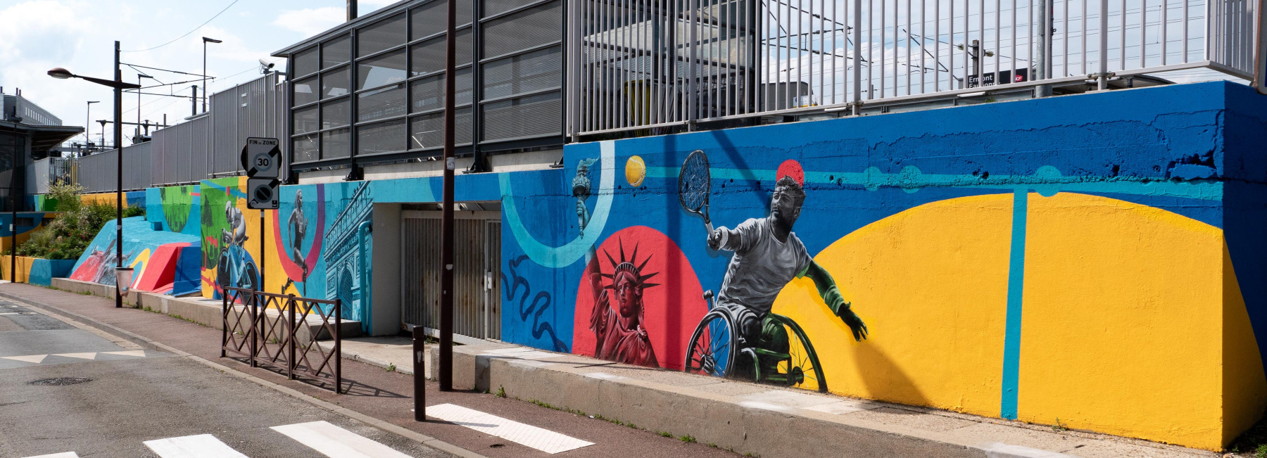 Nous avons eu l'honneur d'être sélectionné pour décorer la gare de Ermont Eaubonne à l'occasion des Jeux Olympiques de Paris 2024. La ville accueillant l'équipe américaine durant les jeux nos artistes graffeurs ont pris soin de leur faire un clin d'œil en y intégrant notamment la statue de la liberté. L'agglomération en charge du projet souhaitait une fresque très coloré, énergique, qui représente également le handisport tout en évoquant la mobilité qu'offre cette gare très connecté à la capitale.